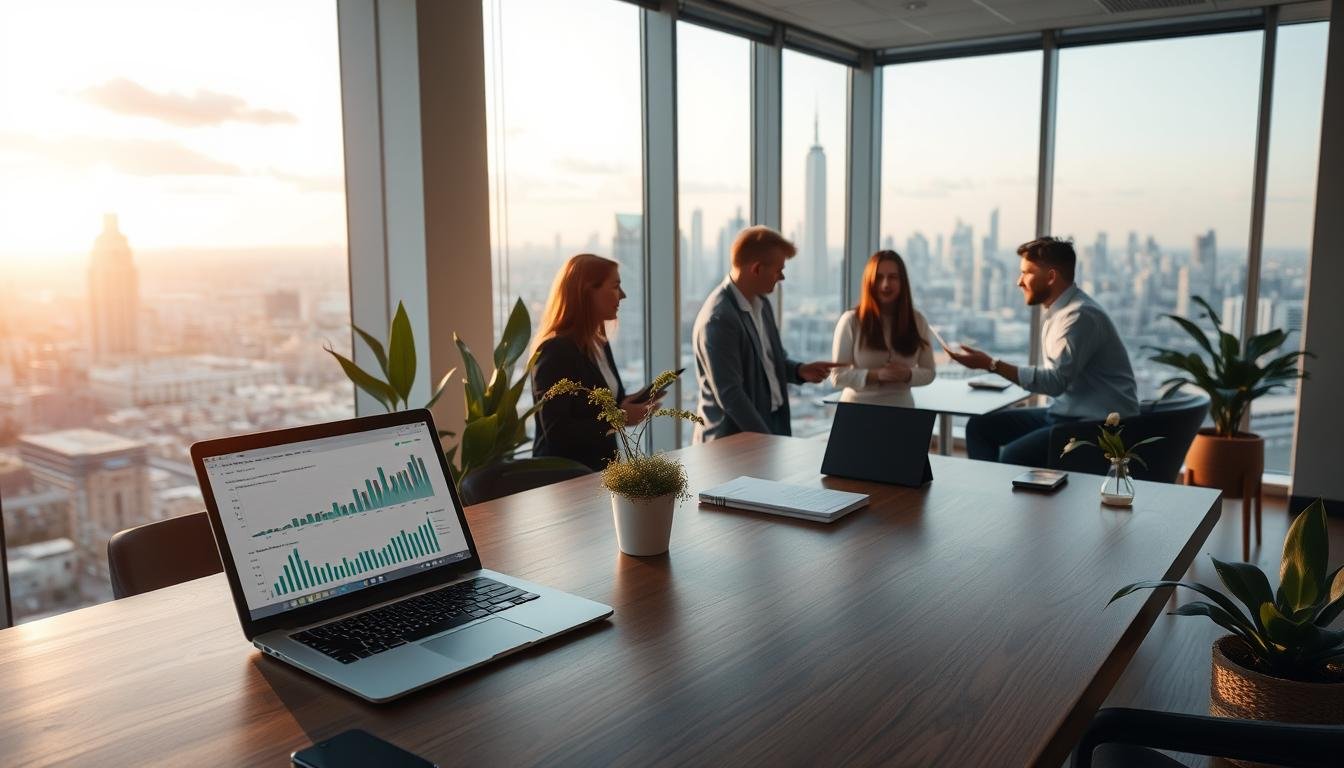 A sleek, modern office setting with large windows overlooking a bustling city skyline. In the foreground, a team of professionals gathered around a conference table, studying financial reports and models projected on a large screen. The middle ground features a colorful infographic displaying different social impact investment funding mechanisms, such as venture capital, impact bonds, and crowdfunding platforms. The background is softly lit, creating a warm and inviting atmosphere that conveys a sense of collaboration and purpose. The image should capture the intersection of finance, technology, and social good, reflecting the idea of "Better Society Capital: Investing for Social Impact."